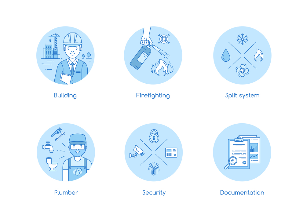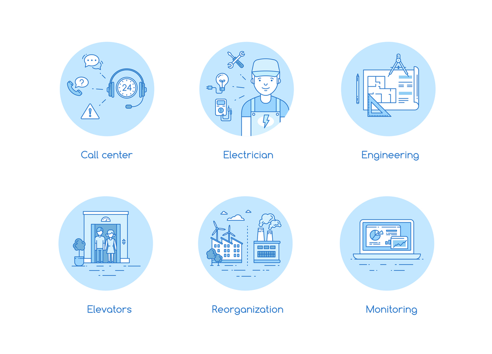 18 icons illustrating different services in flat minimalistic style with linear outline.
